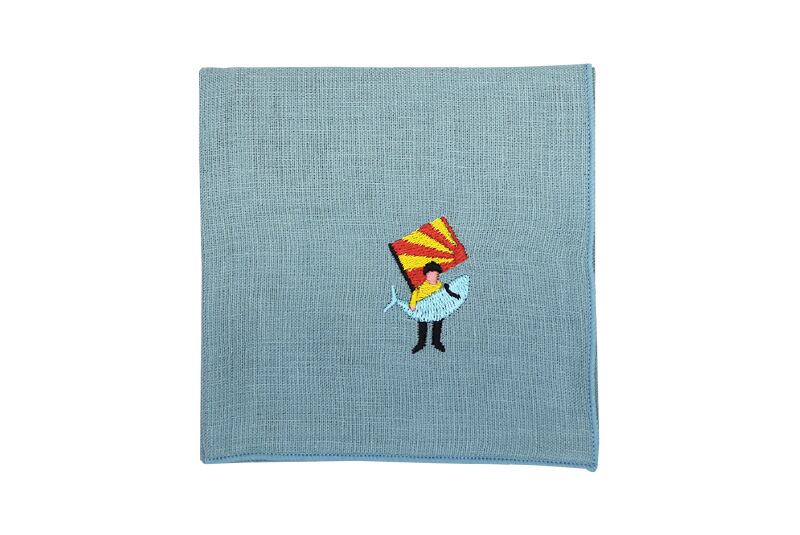 大きな魚を釣り上げて得意げな男の子のチャーミングな刺繍です。